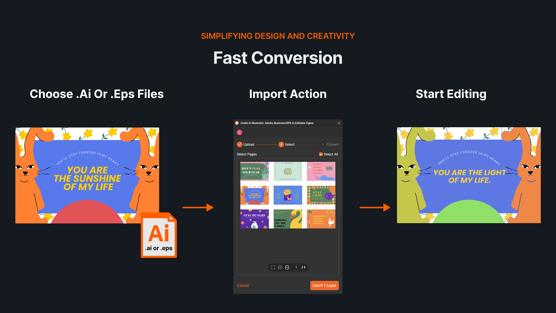 One-click fast conversionInstantly import Adobe Illustrator (.ai and .eps) files into Figma, saving you time and effort with a seamless transition